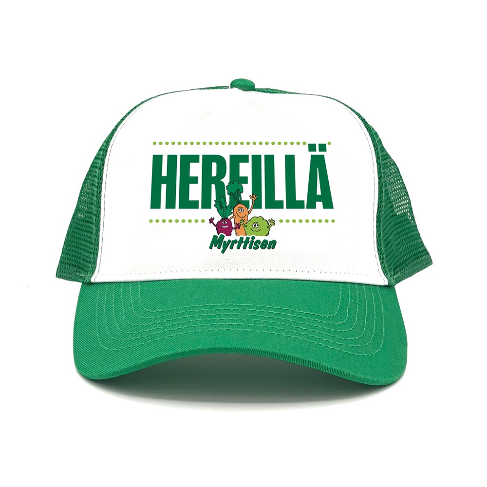 Myrttisen Energy & Recovery -energiajuoman innoittama trucker-mallinen lippis.
